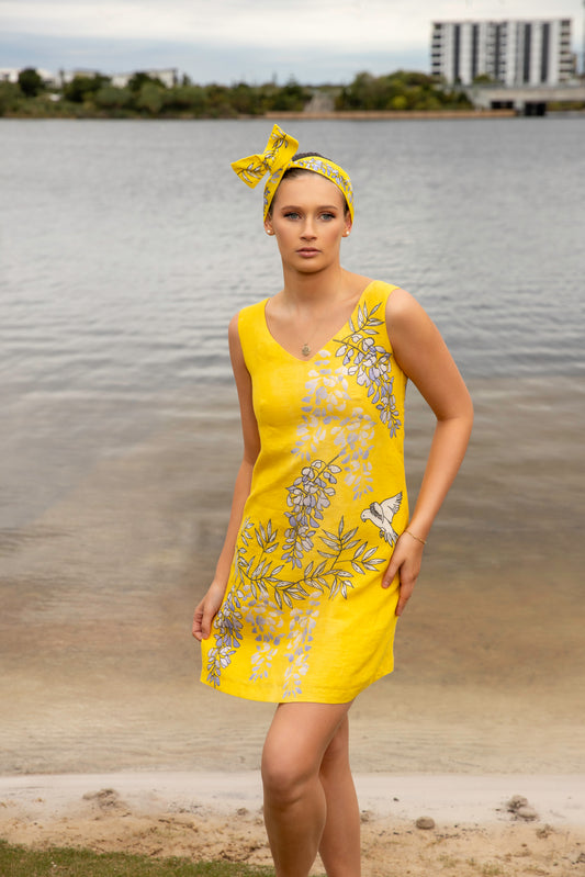 Australian Flax Lillies & Iris V Neckline Sleeveless Shift Dress