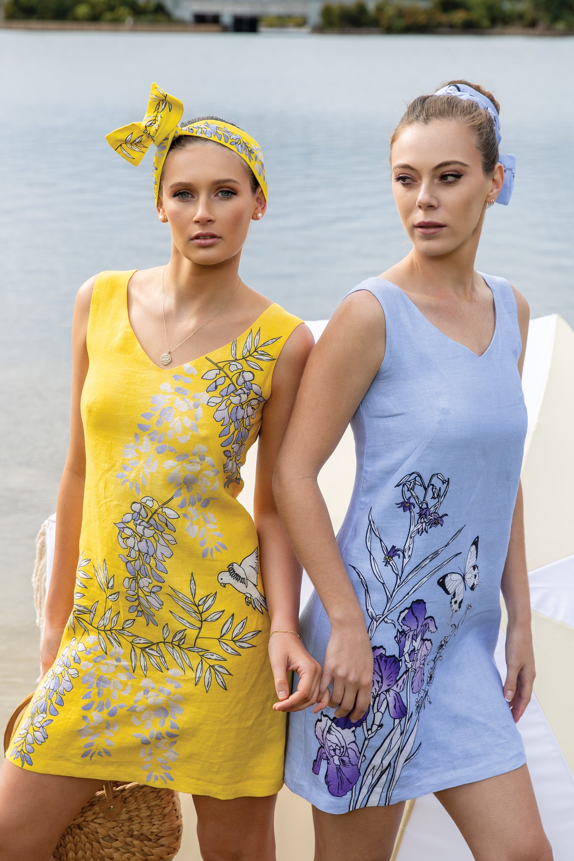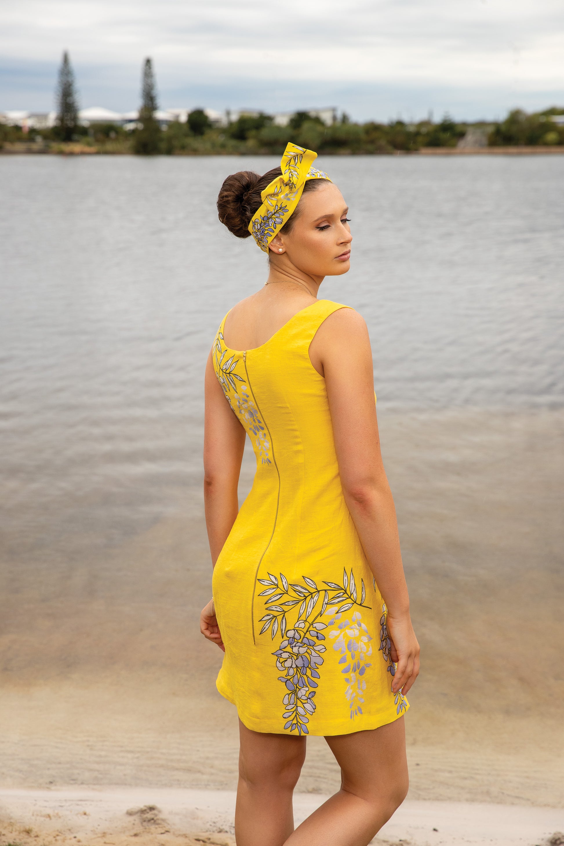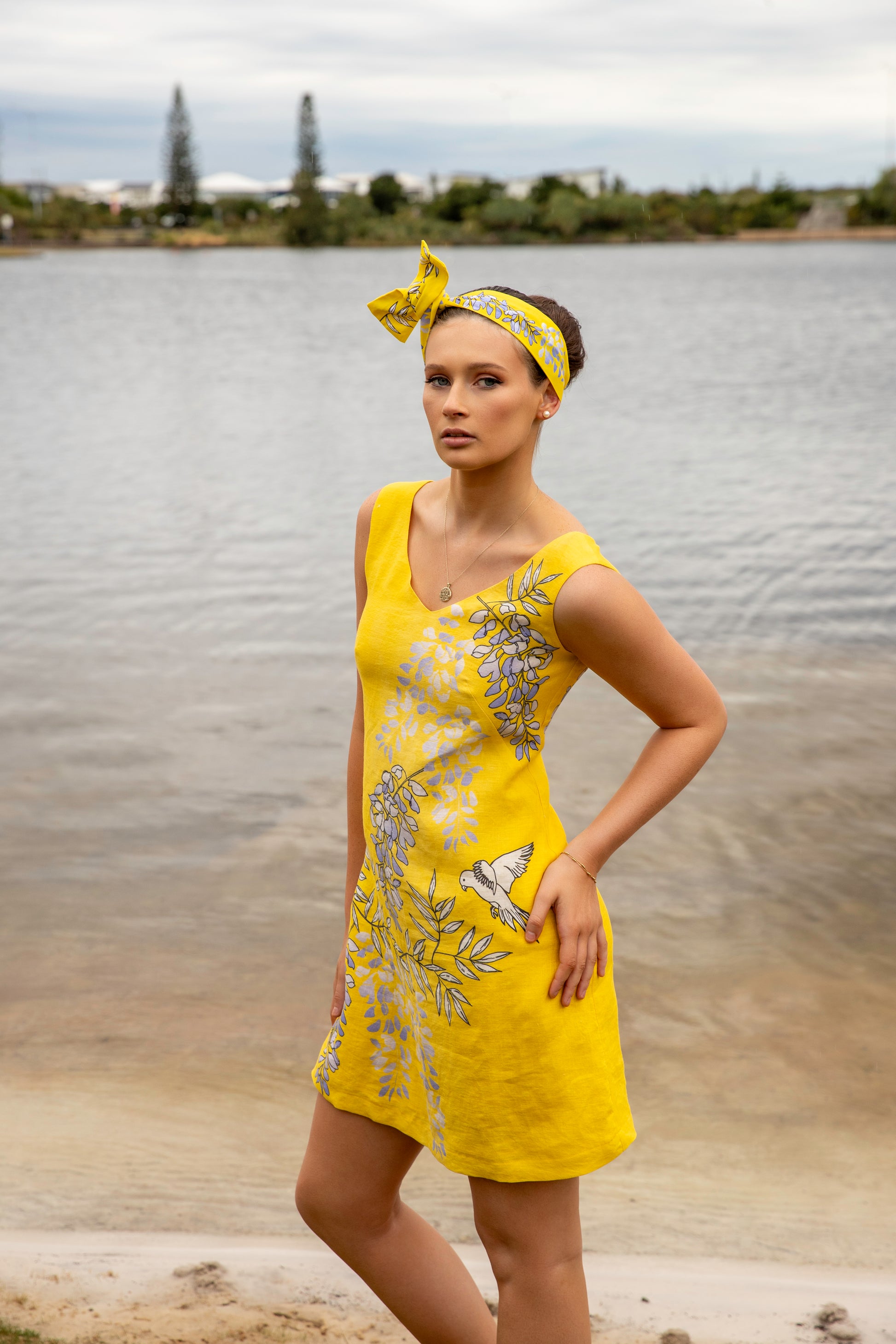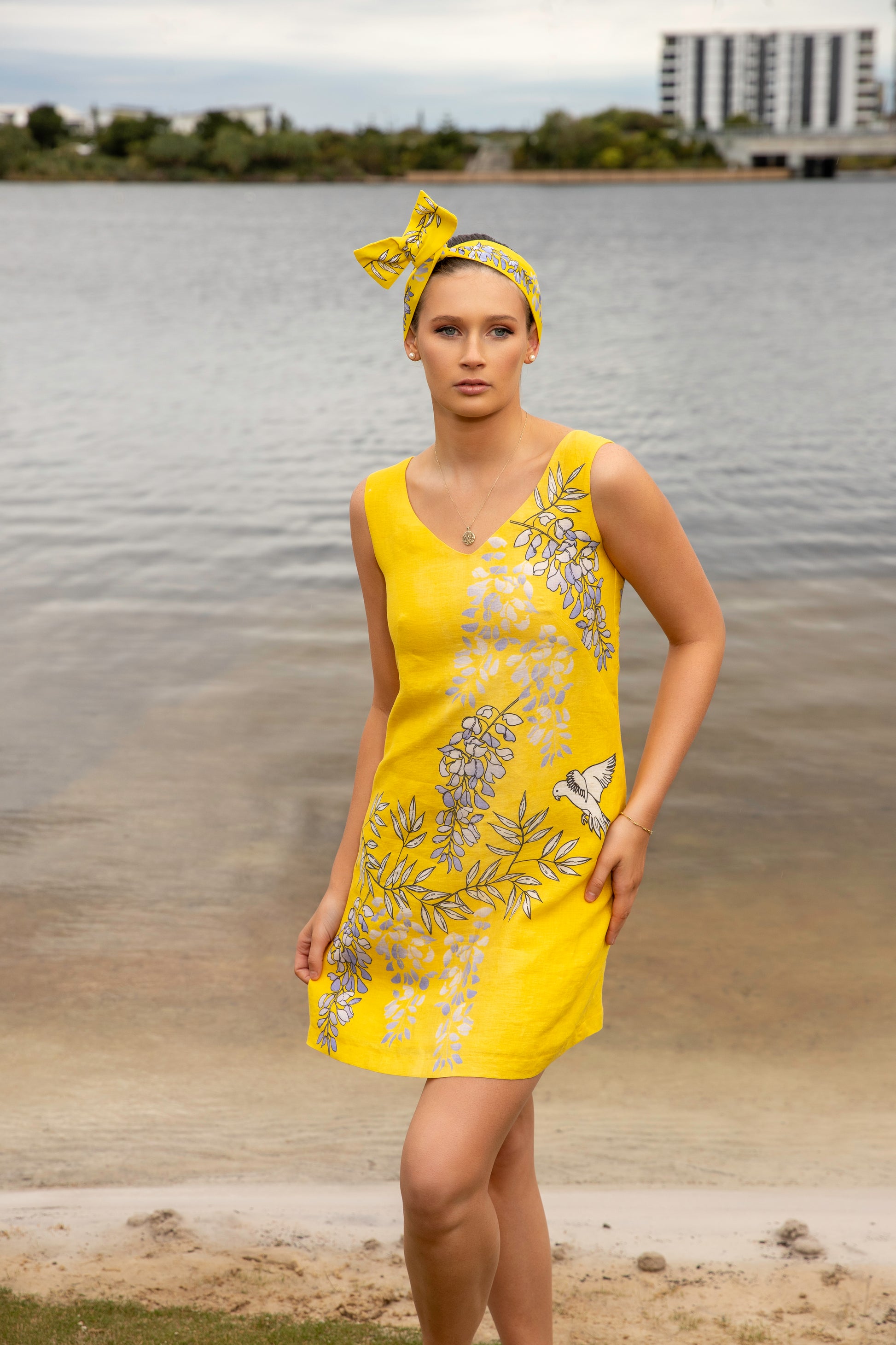 The Wisteria & Lorikeet V Neckline Sleeveless Shift Dress features an exclusive hand-illustrated print — cascading lilac wisteria and playful lorikeets in flight — set against a golden yellow backdrop that captures the warmth of the season and the soul of the Australian landscape.